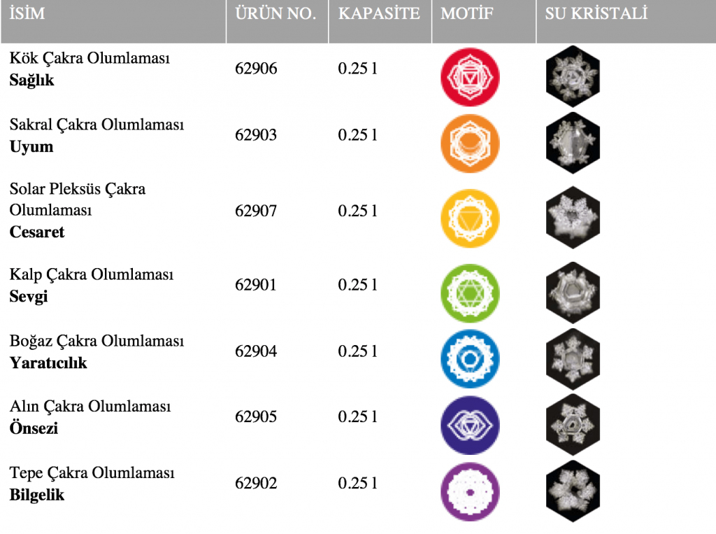 Her olumlama bardağında yer alan renk ve desenler bir çakrayı sembolize ediliyor. Kök, sakral, solar plexus, kalp, boğaz, alın ve tepe çakraları destekleyen semboller, olumlamalar setteki bardaklarda karşımıza çıkıyor.